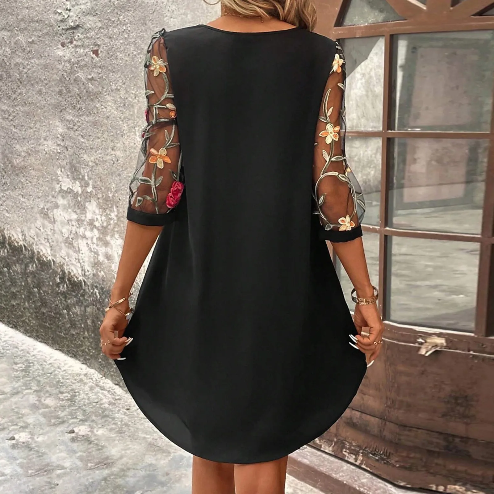The lace-detailed sleeves add a refined, feminine touch that elevates this dress beyond basic casual wear.